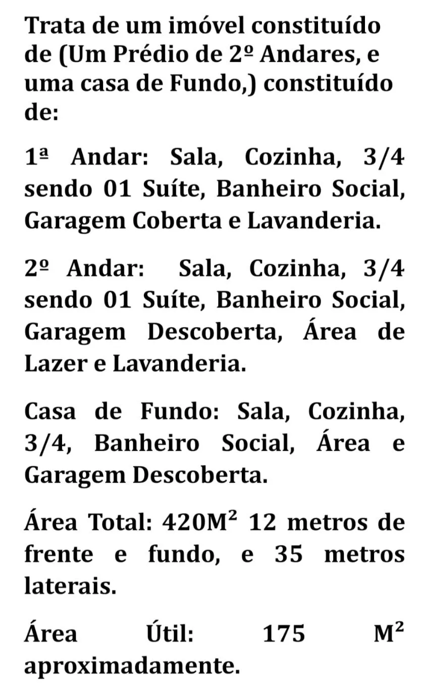 Área total do terreno: 420 m², medindo 12 metros de frente e de fundo, e 35 metros nas laterais.